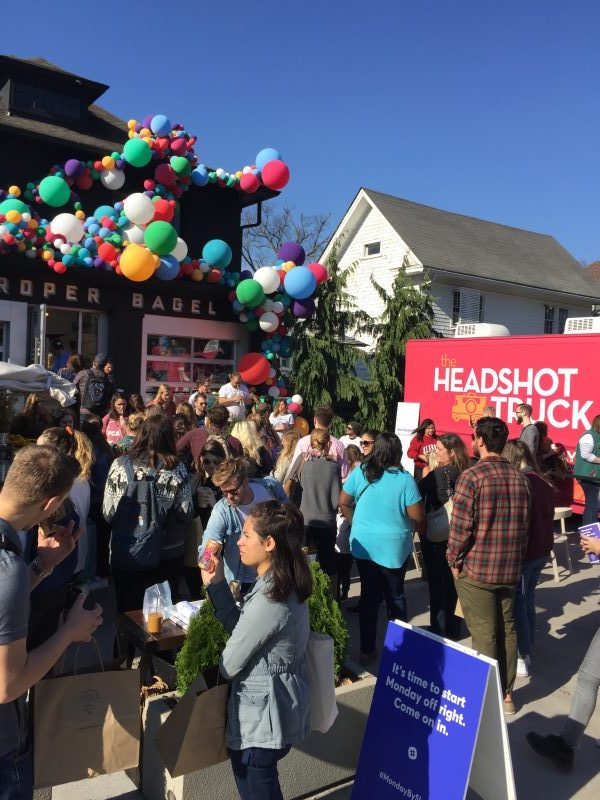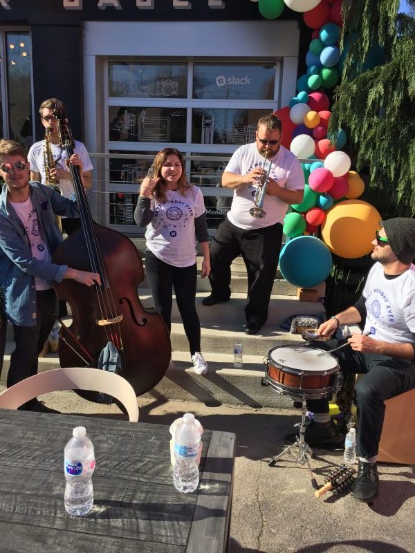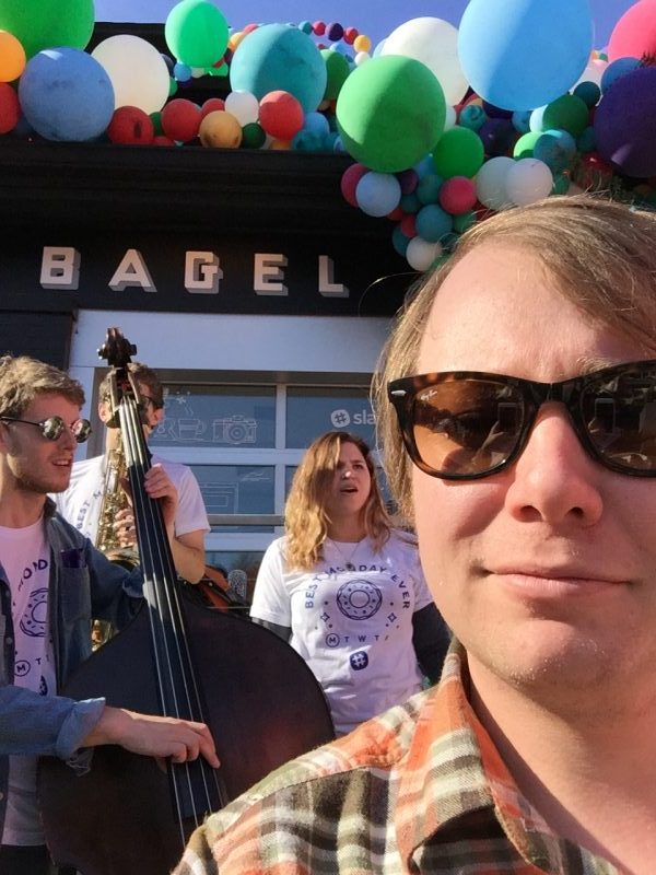 Even before arriving at Proper Bagel, one could see the massive beautiful balloon structure wrapping the outside of the shop adding a nice pop of color to Belmont Boulevard on this sunny morning. Music began to fill the air as we walked up the sidewalk to find a band of smiling, happy people playing one upbeat jazzy tune after another to ward off any Monday blues. At Proper Bagel, we were greeted by the Slack-ers who were helping attendees interact with a variety of cool “slack-tivities”. We kicked things off at the flower cart where fresh cut flowers were beautifully bundled into bright bouquets for guests. We then popped over into the headshot truck to get a few new fresh LinkedIn-worthy pics before making our way inside to get overloaded with fresh baked cookies and the most proper of bagels. The Lightning 100 team had a blast and couldn’t have been happier to spend our Monday morning with the Slack-ontuers and our fellow Nashvillians.